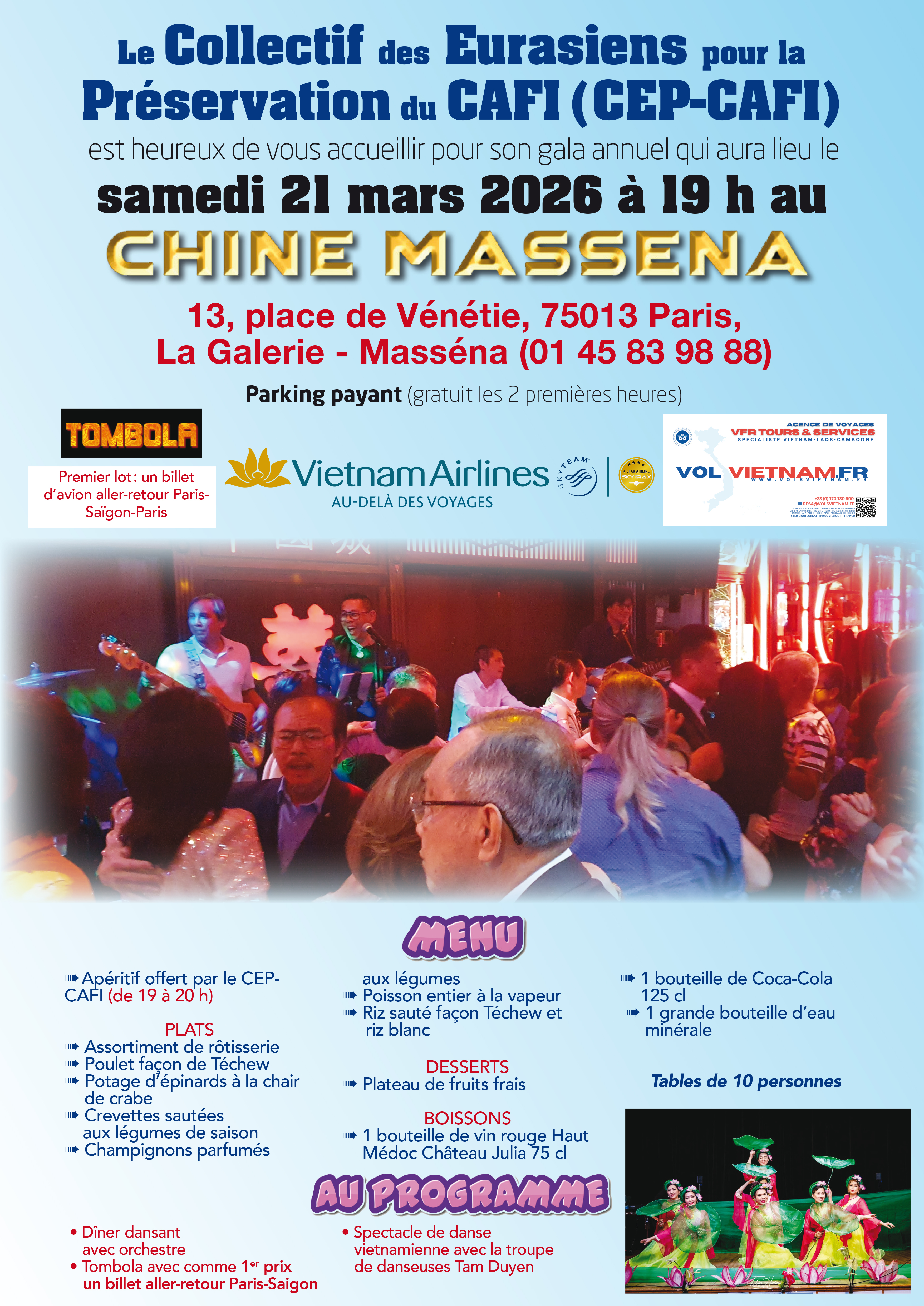 Le grand gala du CEP-CAFI aura lieu cette année au restaurant Chine Masséna le samedi soir 21 Mars 2026 à partir de 19h.